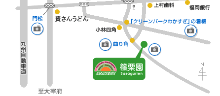 JR福北ゆたか線「篠栗駅」で降車。タクシーで5分。(「篠栗園まで」と言うと、運転手さんに通じます)